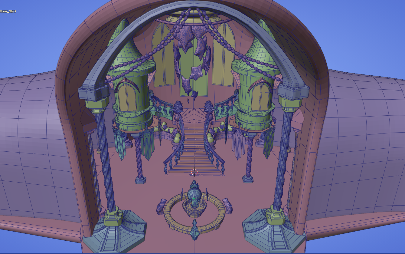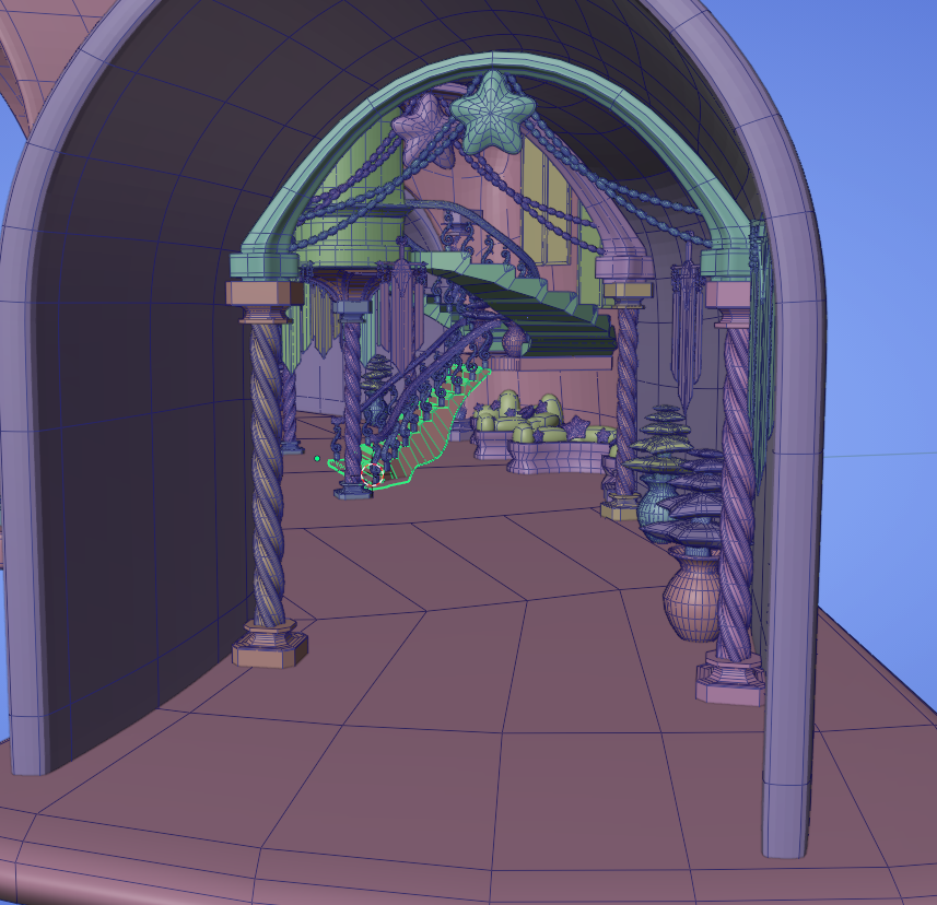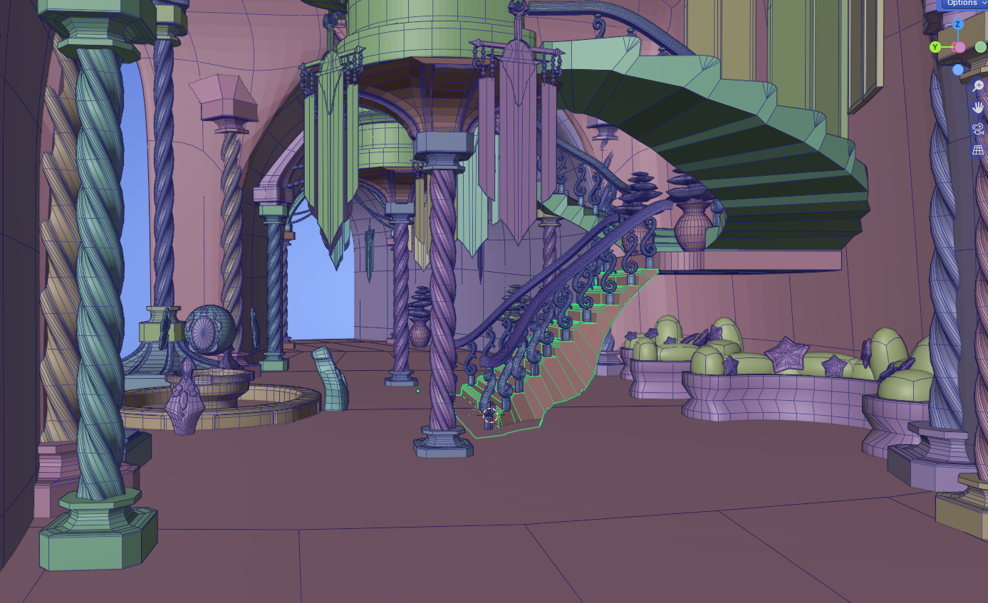 With the girls in a good spot, I diverted my attention to making sure we had all of the sets we needed to start making an animatic. I took on the task of making a main entrance room in the castle, like a foyer of sorts. This flexed a very different modeling muscle in my brain, which was a fun challenge! I knew I wanted a grand staircase leading to the upper rooms of the castle, and I wanted to adorn the place with a lot of arches and pretty pillars. The grand spiral staircase proved to be the most finicky to get right, especially the banister. Curves don't like to keep a uniform thickness when bent harshly, which works wonderfully when making hair, but not so much when you want to make a wooden banister. This took a lot of finagling to look right from the angles we needed, but I got there! Once I got a layout I liked, I inserted the gorgeous assets that Cosette made to really make the place look like a set! The fountain and banners really add to the aesthetic of the place, and I am so excited to see it all textured!