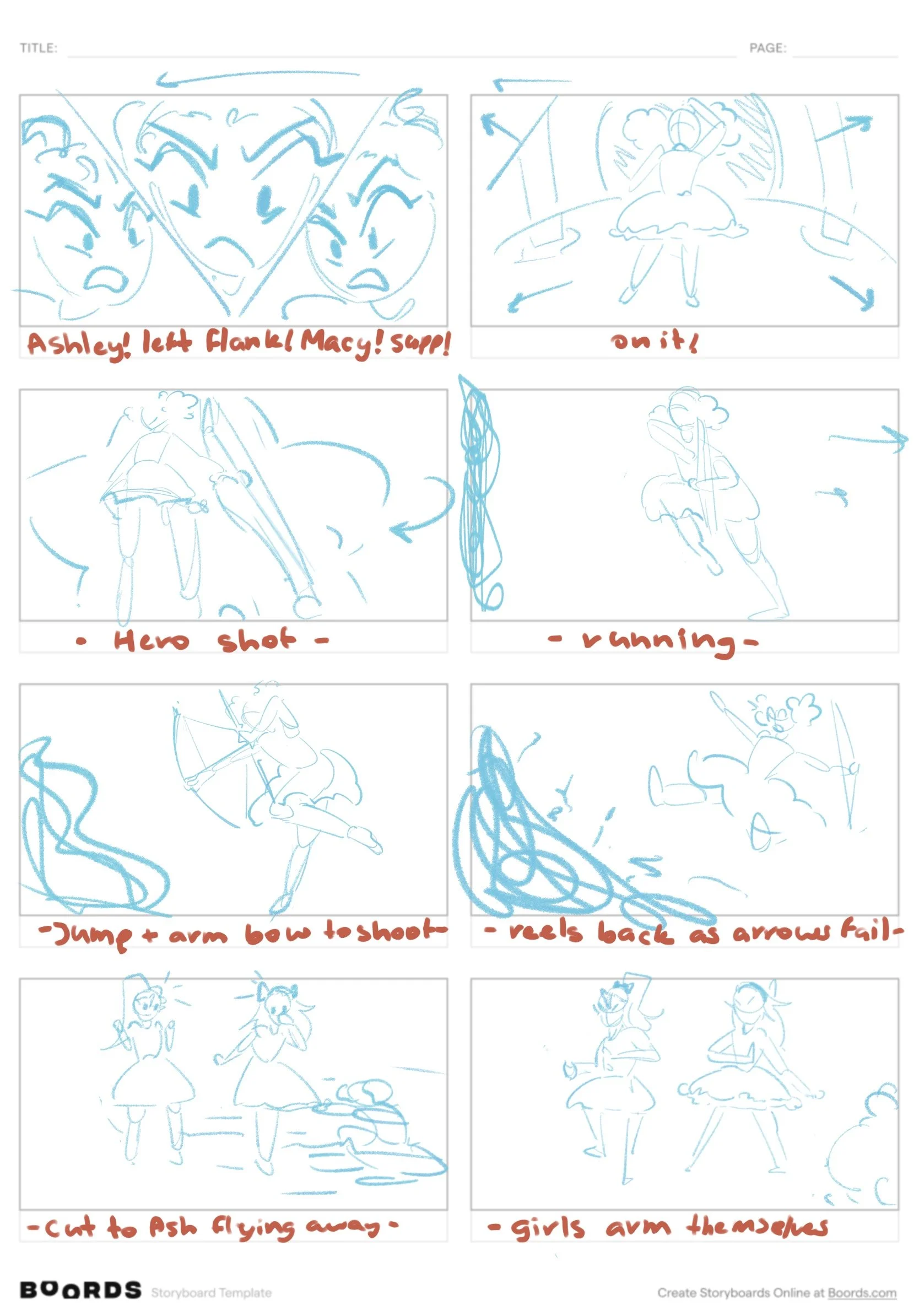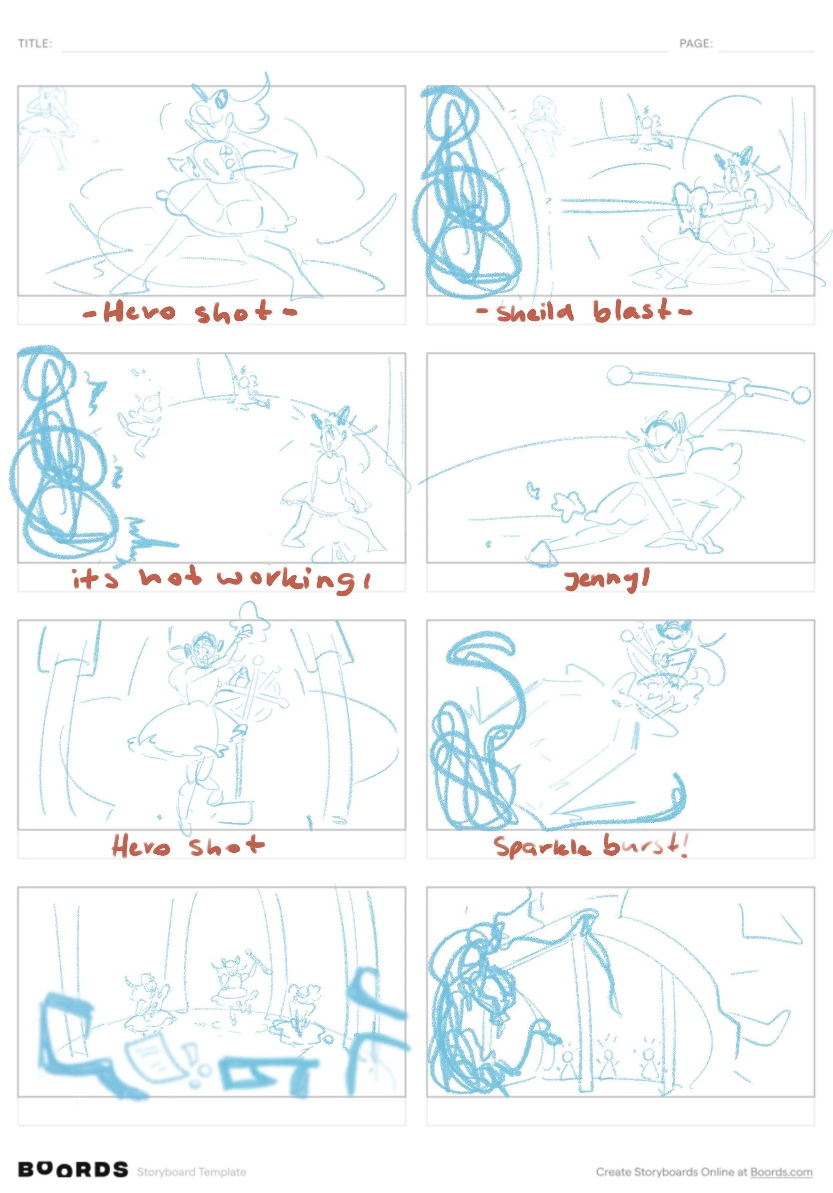 This next task was a lot harder for me to complete, but it didn’t make it any less fulfilling! I have a LOT of experience doing rendered, detailed illustrations, but much less experience doing storyboards and quick thumbnails. This lack of experience makes me an incredibly slow storyboarder, and it drains me pretty quickly! All I can think about is how I should fix each frame rather than just jotting down what I need to. With that in mind, I was assigned to storyboard some of the more complex and detailed shots in the story, which were mostly fight scenes.