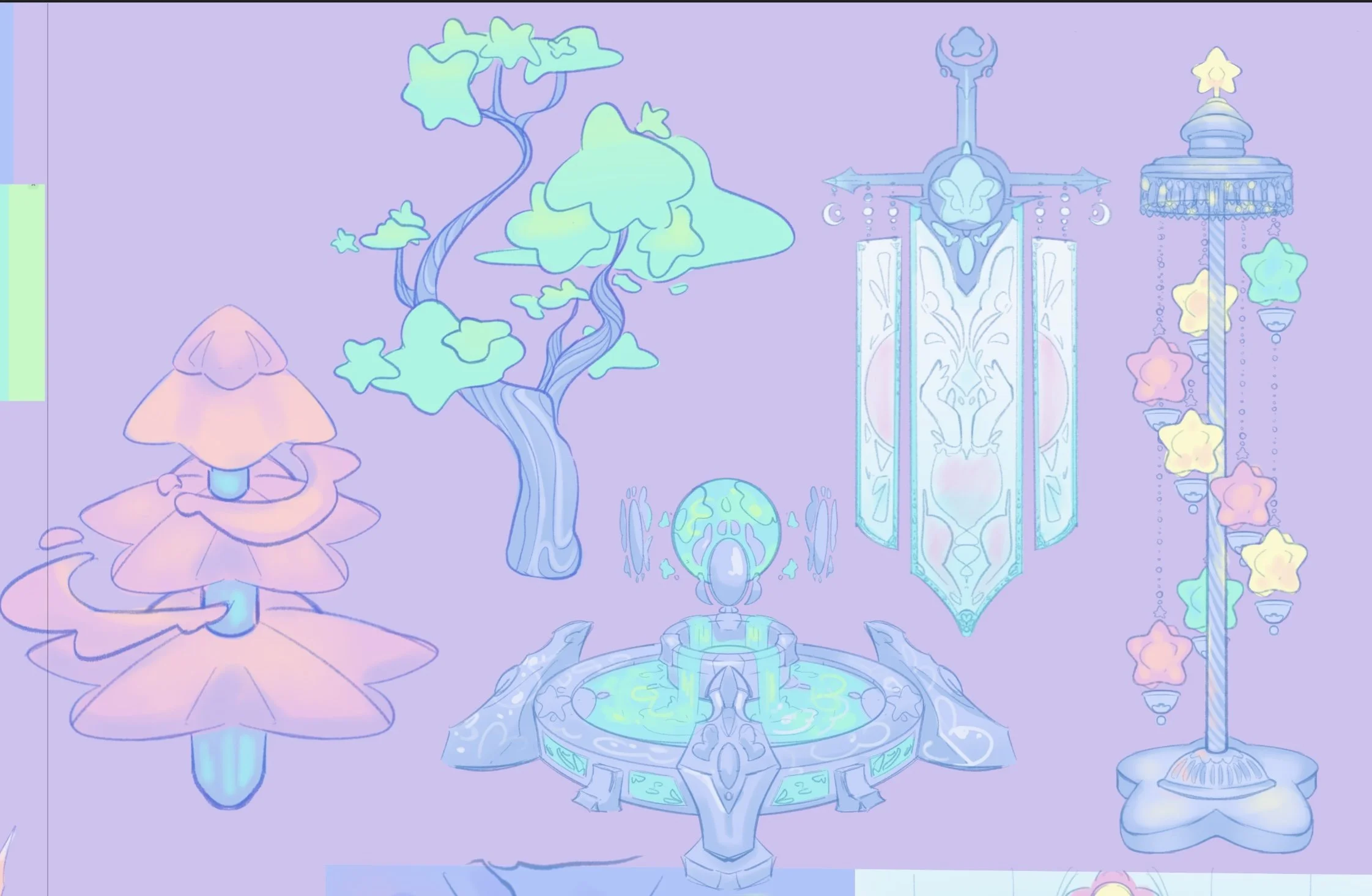 I also wanted a unifying symbol throughout the realm, and the group and I landed on the star. Its simple, an be manipulated into a lot of architectural designs, and is also a part of the girls' outfits, it was perfect! The girls' attacks are also quite sparkly and “starry”, so it just made sense to lean into a more celestial visual motif.
